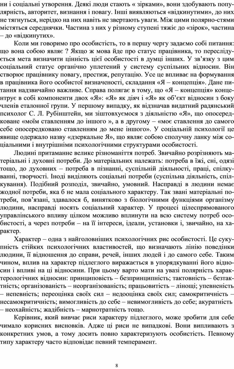 Коли ми говоримо про особистість, то в першу чергу задаємо собі питання: що вона собою являє ? Якщо ж мова йде про статус працівника, то пересліду-ється мета визначити цінність цієї особистості в думці інших. У зв’язку з цим соціальний статус органічно уплетений у систему суспільних відносин. Він створює працівнику повагу, престиж, репутацію. Усе це впливає на формування в працівника його особистої визначеності, складання «Я – концепція». Дане пи-тання надзвичайно важливе. Справа полягає в тому, що «Я – концепція» конце-нтрує в собі компоненти двох «Я»: «Я» як діяч і «Я» як об’єкт відносин з боку членів еталонної групи. У першому випадку, як відзначав видатний радянський психолог С. Л. Рубінштейн, ми зіштовхуємося з діяльністю «Я», що опосеред-коване «моїм ставленням до іншого », а в другому – «моє ставлення до самого себе опосередковано ставленням до мене іншого». У соціальній психології це явище одержало назву «дзеркальне Я», що являє собою сполучну ланку між со-ціальними і внутрішніми психологічними структурами особистості.