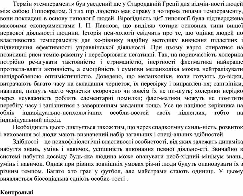 Термін «темперамент» був уведений ще у Стародавній Греції для відмін-ності людей між собою Гіппократом. З тих пір людство має справу з чотирма типами темпераменту, вони покладені в основу типології людей. Вірогідність цієї типології була підтверджена масовими експериментами І. П. Павлова, що виділяв чотири основних типи вищої нервової діяльності людини. Історія пси-хології свідчить про те, що оцінка людей по властивостях темпераменту дає ке-рівнику надійну методику вивчення підлеглих і підвищення ефективності управлінської діяльності. При цьому варто спиратися на позитивні риси темпе-раменту і переборювати негативні. Так, на поривчастість холерика потрібно ре-агувати тактовністю і стриманістю, інертності флегматика найкраще протиста-вляти активність, а емоційність і сумніви меланхоліка можна нейтралізувати непідробленою оптимістичністю. Доведено, що меланхоліки, коли готують до-відки, витрачають багато часу на складання чернеток, їх перевірку і виправлен-ня; сангвініки, навпаки, пишуть часто чернетки скорочено чи зовсім їх не пи-шуть; холерики нерідко через неуважність роблять елементарні помилки; флег-матики можуть не помітити перебігу часу і запізнитися з завершенням завдання тощо. Усе це націлює керівника на облік індивідуально-психологічних особли-востей своїх підлеглих, тобто на індивідуальний підхід.
