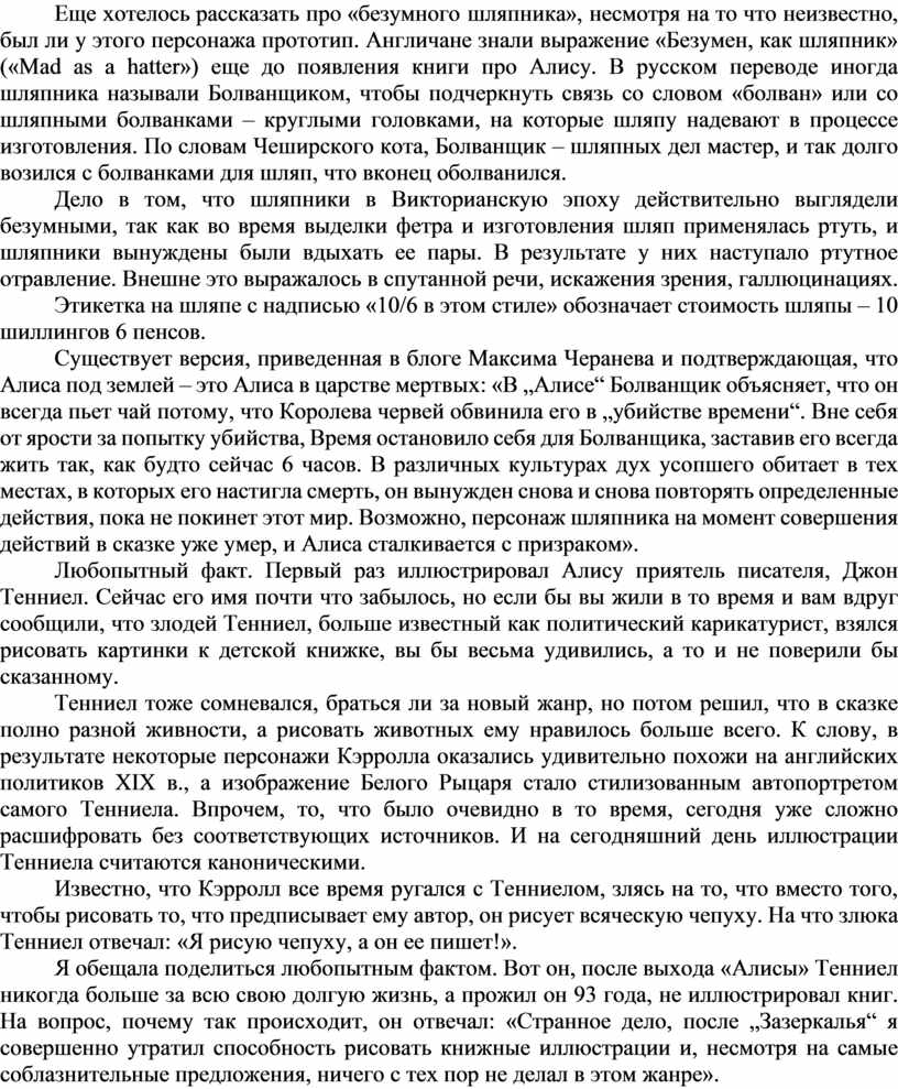 Еще хотелось рассказать про «безумного шляпника», несмотря на то что неизвестно, был ли у этого персонажа прототип. Англичане знали выражение «Безумен, как шляпник» («Mad as a hatter») еще до появления книги про Алису. В русском переводе иногда шляпника называли Болванщиком, чтобы подчеркнуть связь со словом «болван» или со шляпными болванками – круглыми головками, на которые шляпу надевают в процессе изготовления. По словам Чеширского кота, Болванщик – шляпных дел мастер, и так долго возился с болванками для шляп, что вконец оболванился.