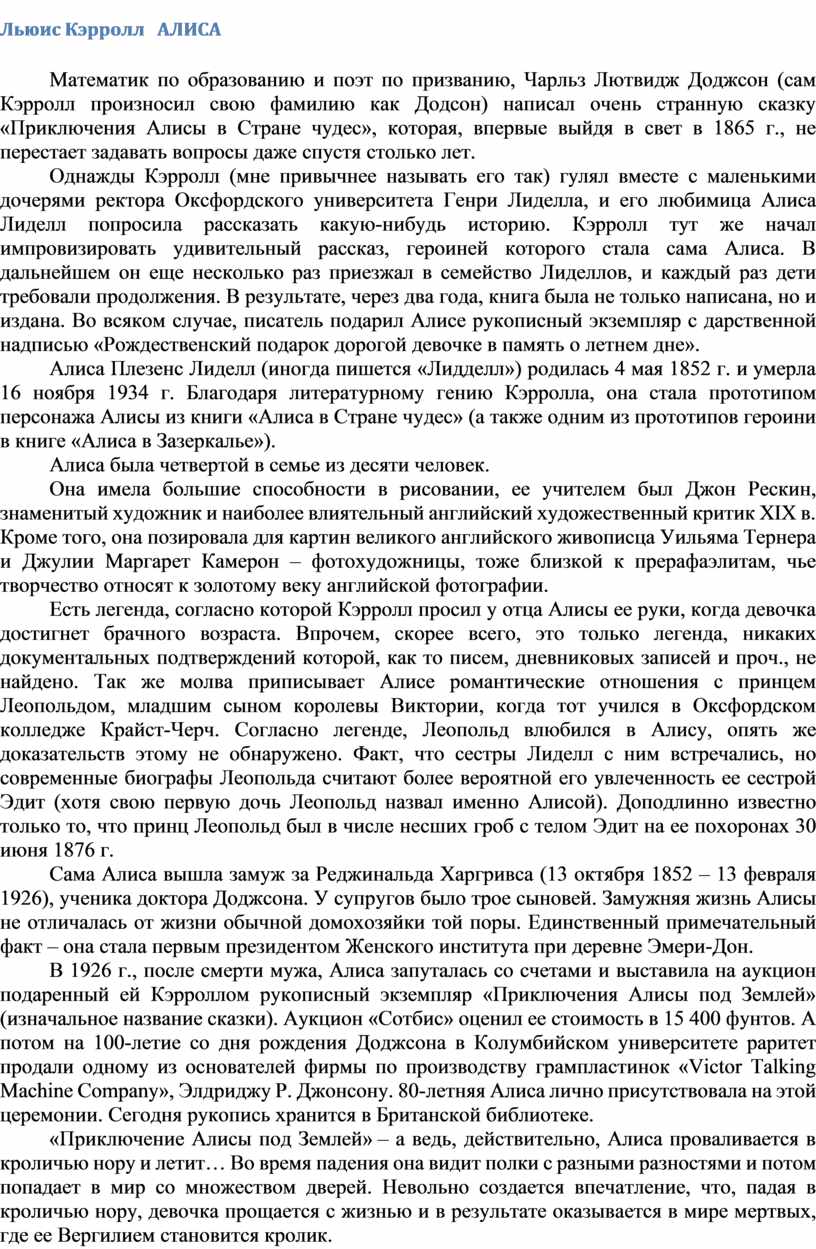 Однажды Кэрролл (мне привычнее называть его так) гулял вместе с маленькими дочерями ректора Оксфордского университета Генри Лиделла, и его любимица Алиса Лиделл попросила рассказать какую-нибудь историю. Кэрролл тут же начал импровизировать удивительный рассказ, героиней которого стала сама Алиса. В дальнейшем он еще несколько раз приезжал в семейство Лиделлов, и каждый раз дети требовали продолжения. В результате, через два года, книга была не только написана, но и издана. Во всяком случае, писатель подарил Алисе рукописный экземпляр с дарственной надписью «Рождественский подарок дорогой девочке в память о летнем дне».