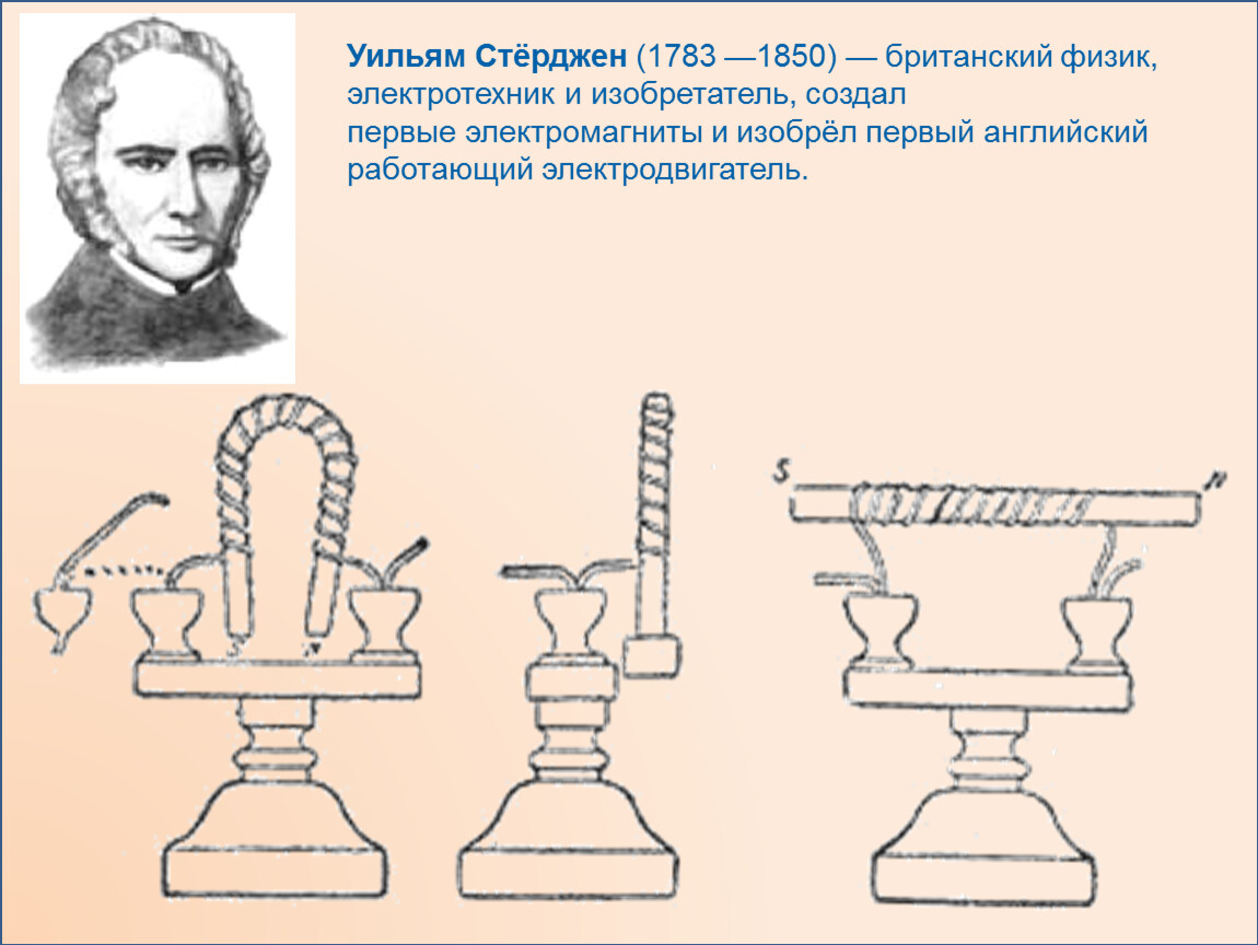 Уильям Стёрджен (1783 —1850) — британский физик, электротехник и изобретатель, создал первые электромагниты и изобрёл первый английский работающий электродвигатель.