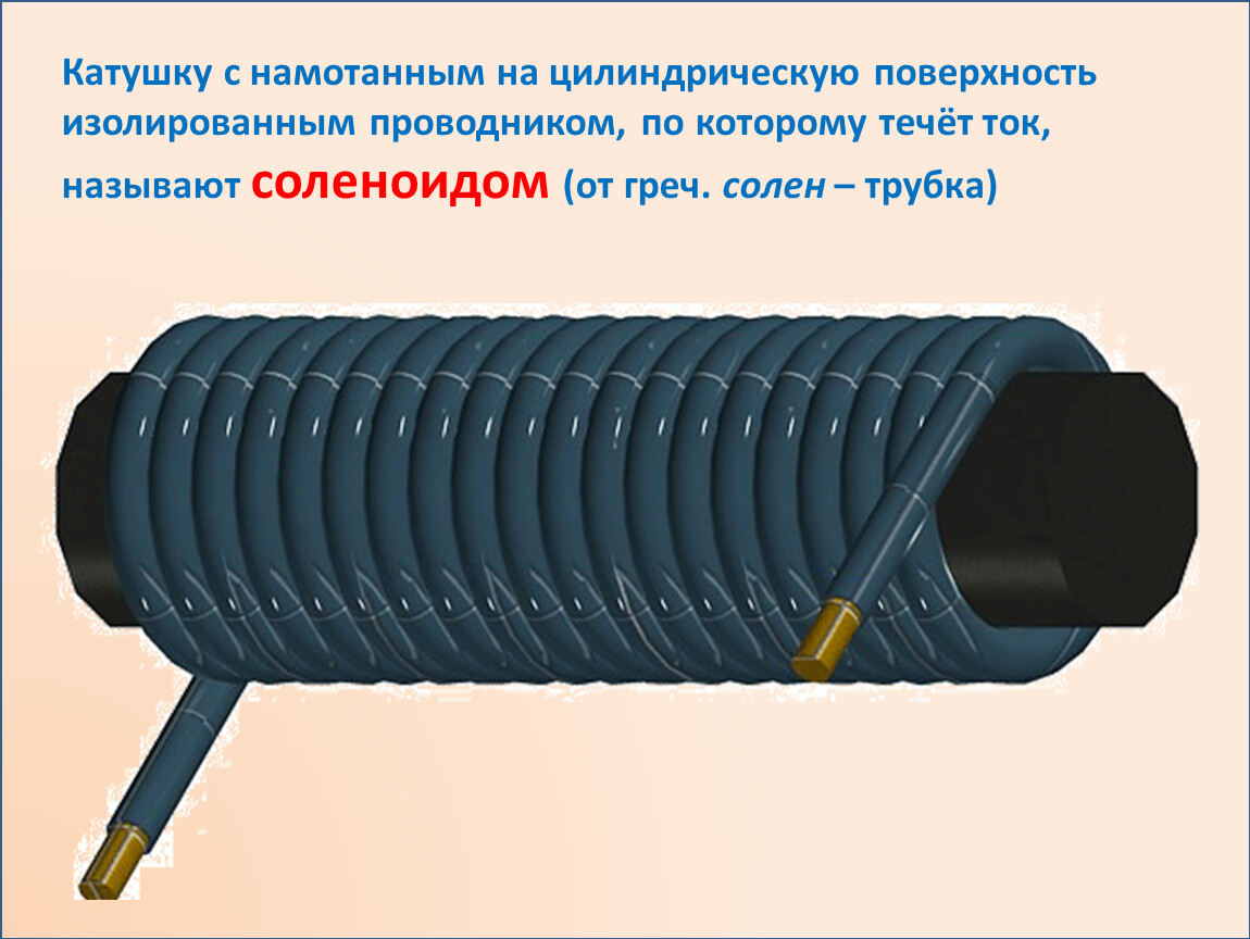 Катушку с намотанным на цилиндрическую поверхность изолированным проводником, по которому течёт ток, называют соленоидом (от греч. солен – трубка)