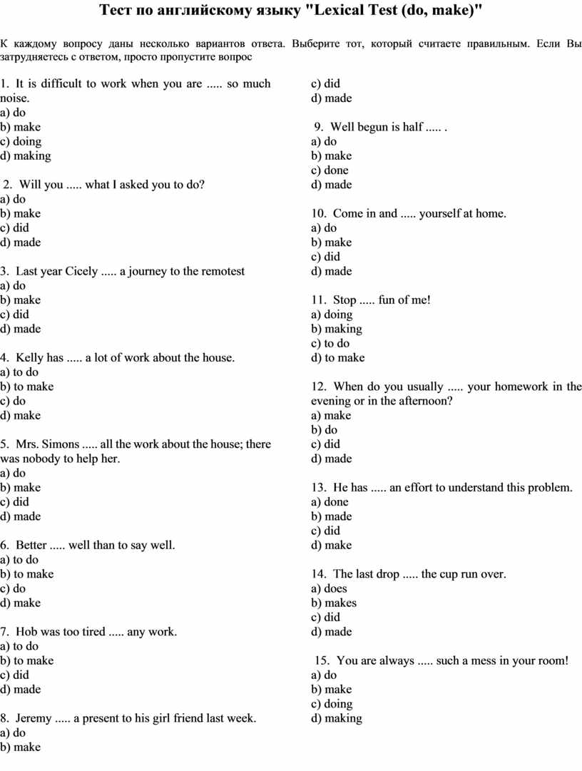 Тест по английскому языку "Lexical Test (do, make)"