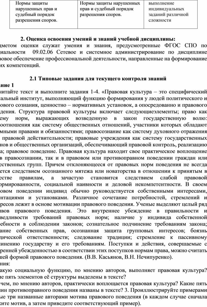 Предметом оценки служат умения и знания, предусмотренные ФГОС СПО по специальности 09.02.06 Сетевое и системное администрирование по дисциплине Правовое обеспечение профессиональной деятельности, направленные на формирование общих компетенций.