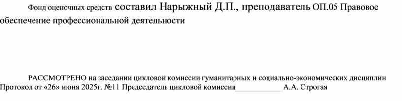 Фонд оценочных средств составил Нарыжный Д.П., преподаватель ОП.05 Правовое обеспечение профессиональной деятельности