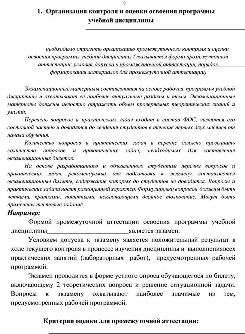 необходимо отразить организацию промежуточного контроля и оценки освоения программы учебной дисциплины (указывается форма промежуточной