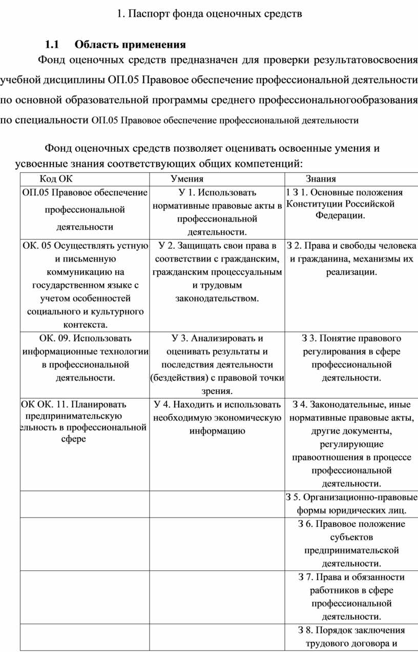 Фонд оценочных средств предназначен для проверки результатов освоения учебной дисциплины ОП.05 Правовое обеспечение профессиональной деятельности по основной образовательной программы среднего профессионального образования по специальности ОП.05 Правовое обеспечение профессиональной деятельности
