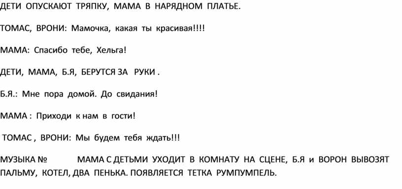 МУЗЫКА № МАМА С ДЕТЬМИ УХОДИТ В КОМНАТУ НА СЦЕНЕ, Б.Я и ВОРОН ВЫВОЗЯТ ПАЛЬМУ, КОТЕЛ, ДВА ПЕНЬКА. ПОЯВЛЯЕТСЯ ТЕТКА РУМПУМПЕЛЬ.