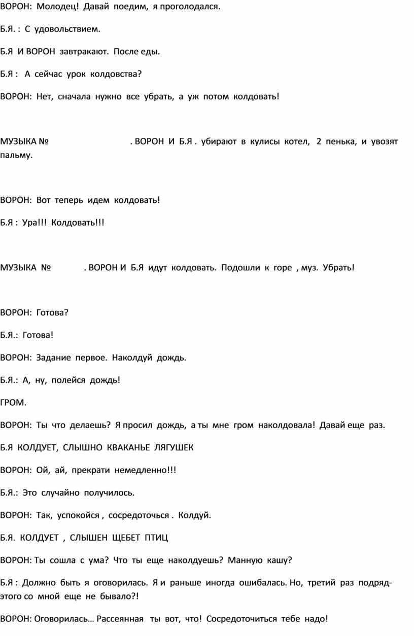 МУЗЫКА № выходят две ведьмы, открывают занавес . на сцене стоит пальма , котел , 2 пенька. Прислонившись к пальме , спит ВОРОН. Выходит М.Б.Я. , с метлой, танцует. После танца М. Б . Я.