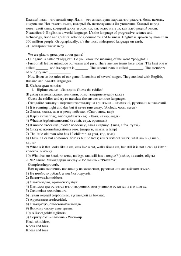 1) Бірінші сайыс: Жұмбақтар (Riddles – Загадки)