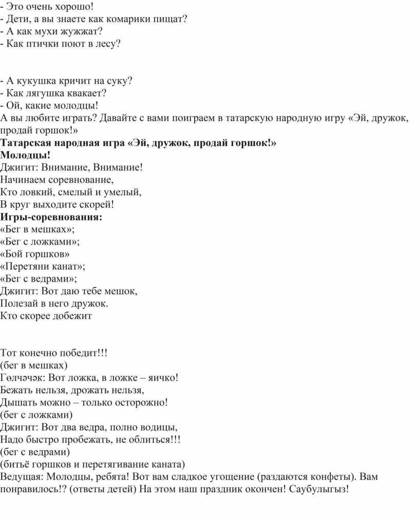 Сегодны мы отмечаем татарский народный праздник – Сабантуй. А вы знаете что означает слово Сабантуй? А когда его отмечают? (ответы детей) Поздравляем всех вас с веселым праздником Сабантуй. Это самый любимый, самый веселый, самый торжественный народный праздник. Он проводится после окончания весенних полевых работ. На этом празднике люди соревнуются в силе, ловкости и выносливости. Сегодня мы собрались, чтобы провести этот веселый праздник вместе.