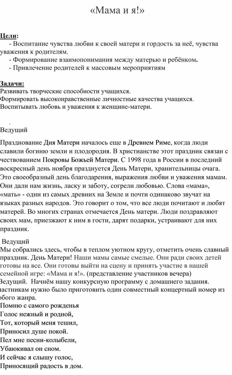 Мы собрались здесь, чтобы в теплом уютном кругу, отметить очень славный праздник. День Матери! Наши мамы самые смелые. Они ради своих детей готовы на все. Они готовы выйти на сцену и принять участие в нашей семейной игре: «Мама и я!». (представление участников вечера)