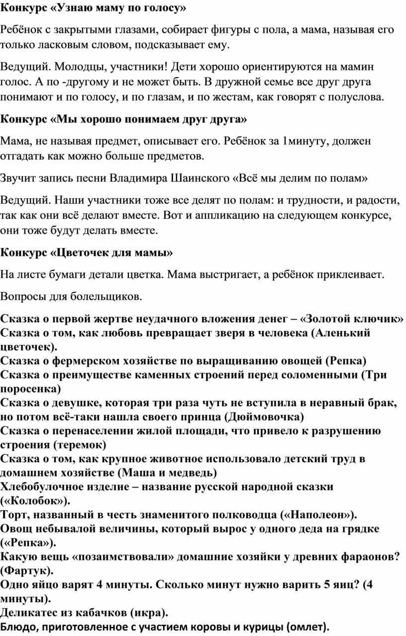 Ведущий. Молодцы, участники! Дети хорошо ориентируются на мамин голос. А по -другому и не может быть. В дружной семье все друг друга понимают и по голосу, и по глазам, и по жестам, как говорят с полуслова.