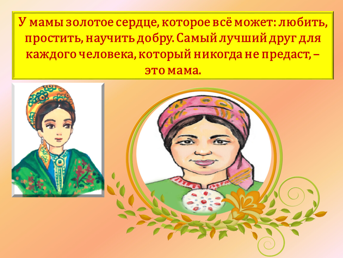 У мамы золотое сердце, которое всё может: любить, простить, научить добру. Самый лучший друг для каждого человека, который никогда не предаст, – это мама.