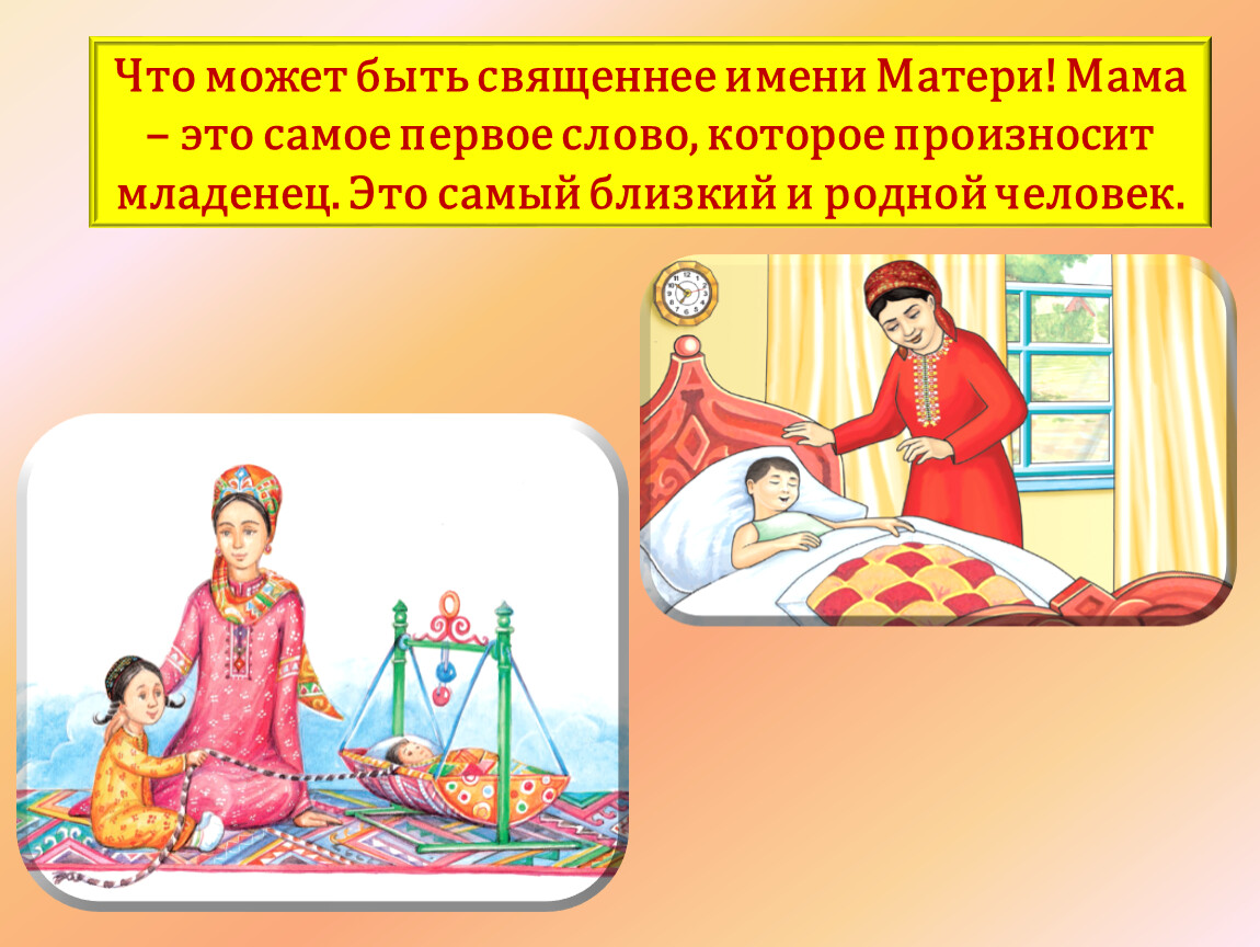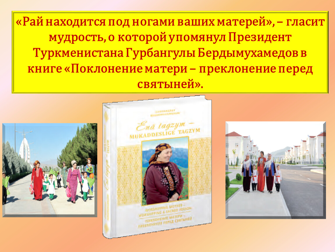 «Рай находится под ногами ваших матерей», – гласит мудрость, о которой упомянул Президент Туркменистана Гурбангулы Бердымухамедов в книге «Поклонение матери – преклонение перед святыней».