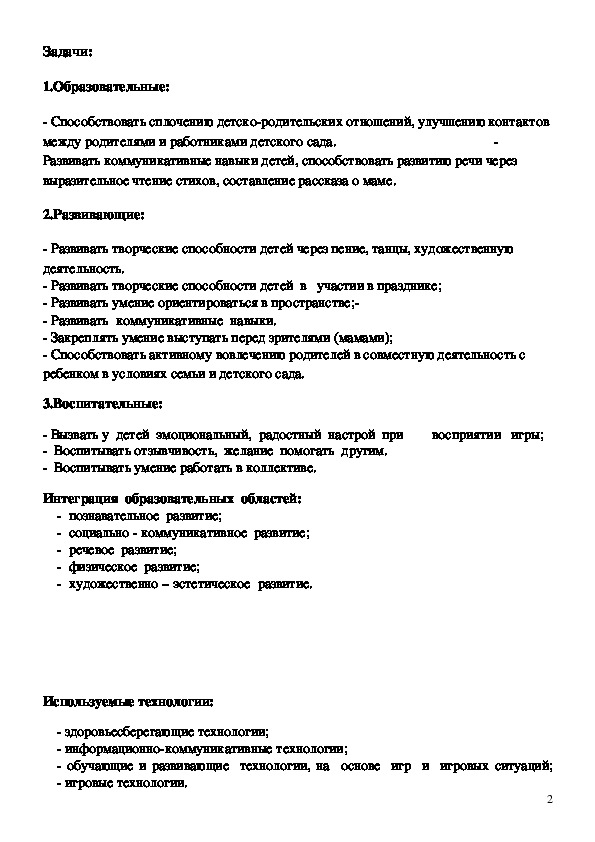 - Способствовать сплочению детско-родительских отношений, улучшению контактов между родителями и работниками детского сада. - Развивать коммуникативные навыки детей, способствовать развитию речи через выразительное чтение стихов, составление рассказа о маме.
