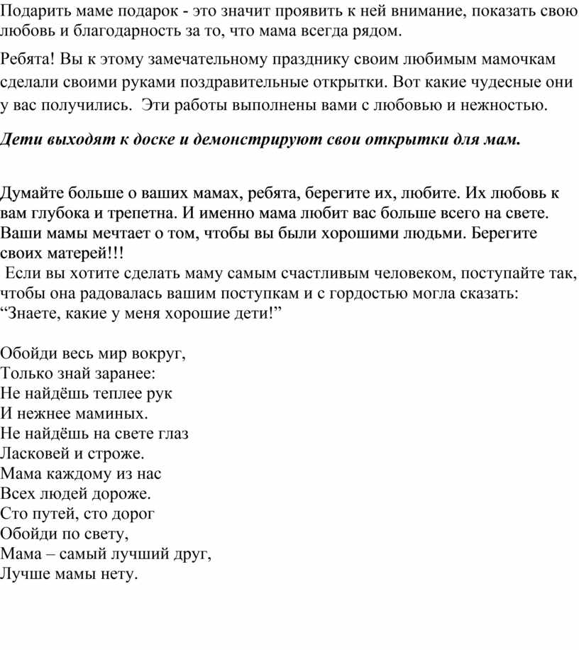 Дорогие ребята! Мы собрались сегодня, чтобы поговорить с вами о самом дорогом и близком каждому человеку - о матери. Я думаю, что сегодняшняя наша беседа заставит многих из вас задуматься, другими глазами посмотреть на себя и свое поведение по отношению к близким вам людям.