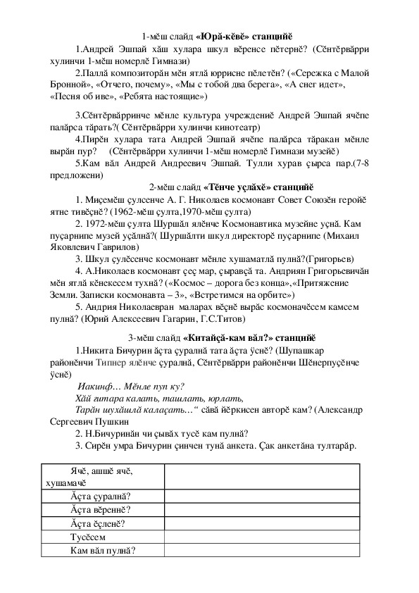 1.Андрей Эшпай хăш хулара шкул вĕренсе пĕтернĕ? (Сĕнтĕрвăрри