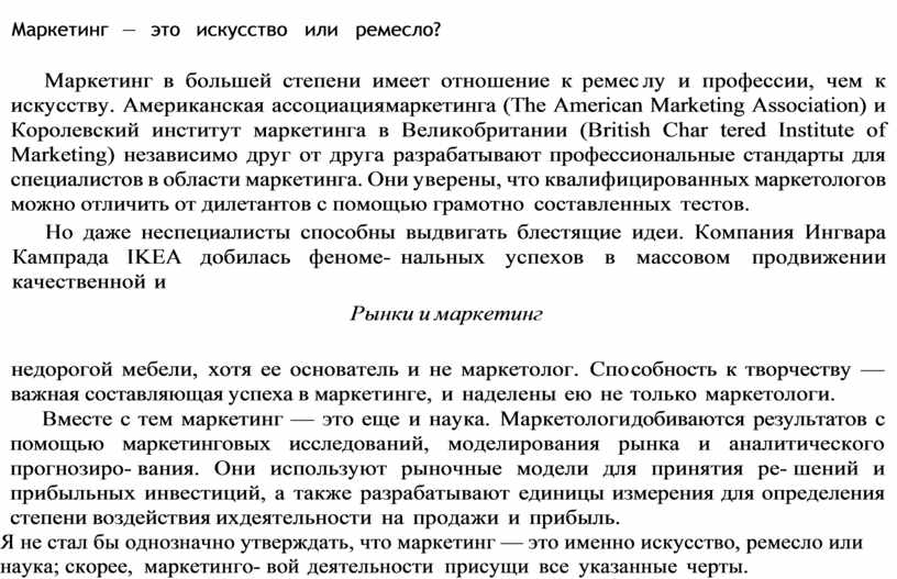 Я не стал бы однозначно утверждать, что маркетинг — это именно искусство, ремесло или наука; скорее, маркетинго вой деятельности присущи все указанные черты.