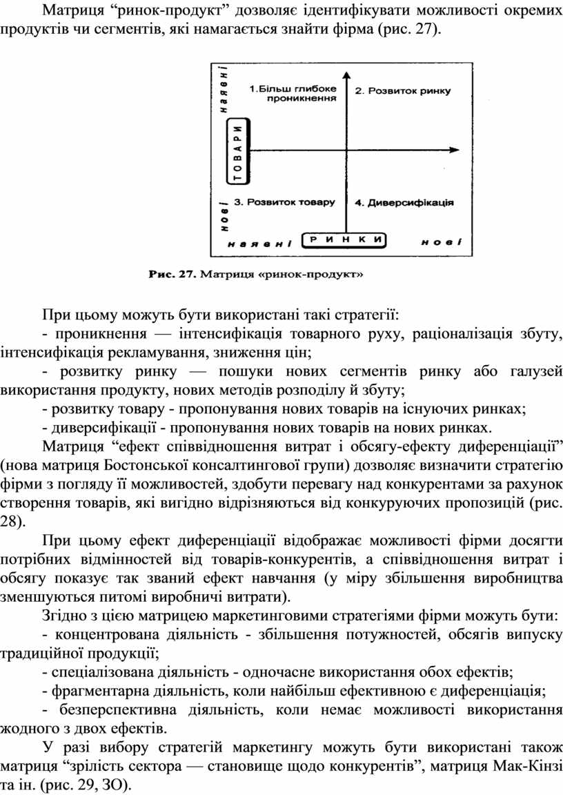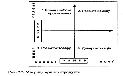 Матриця “ринок-продукт” дозволяє ідентифікувати можливості окремих продуктів чи сегментів, які намагається знайти фірма (рис. 27).