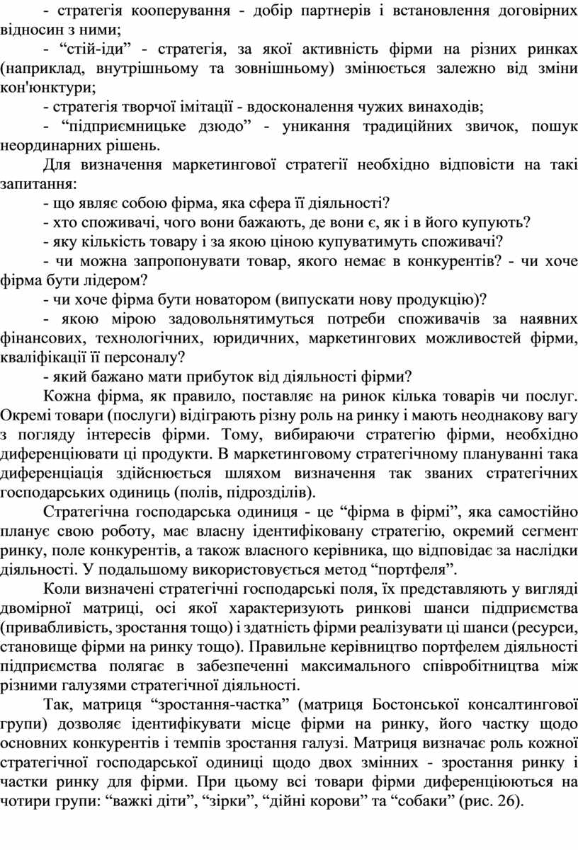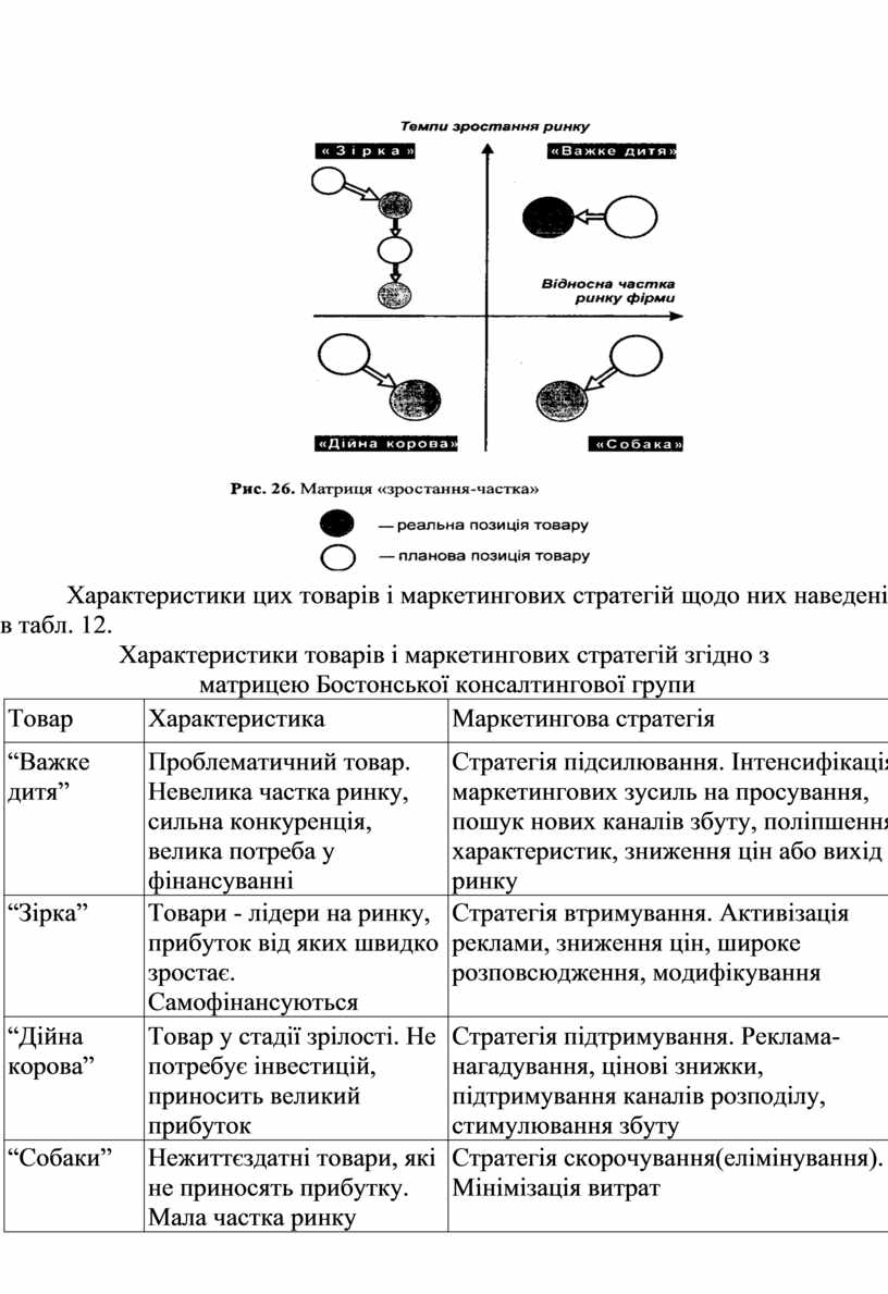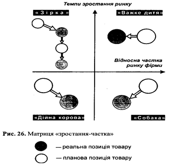 Так, матриця “зростання-частка” (матриця Бостонської консалтингової групи) дозволяє ідентифікувати місце фірми на ринку, його частку щодо основних конкурентів і темпів зростання галузі. Матриця визначає роль кожної стратегічної господарської одиниці щодо двох змінних - зростання ринку і частки ринку для фірми. При цьому всі товари фірми диференціюються на чотири групи: “важкі діти”, “зірки”, “дійні корови” та “собаки” (рис. 26).