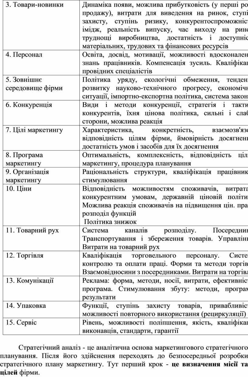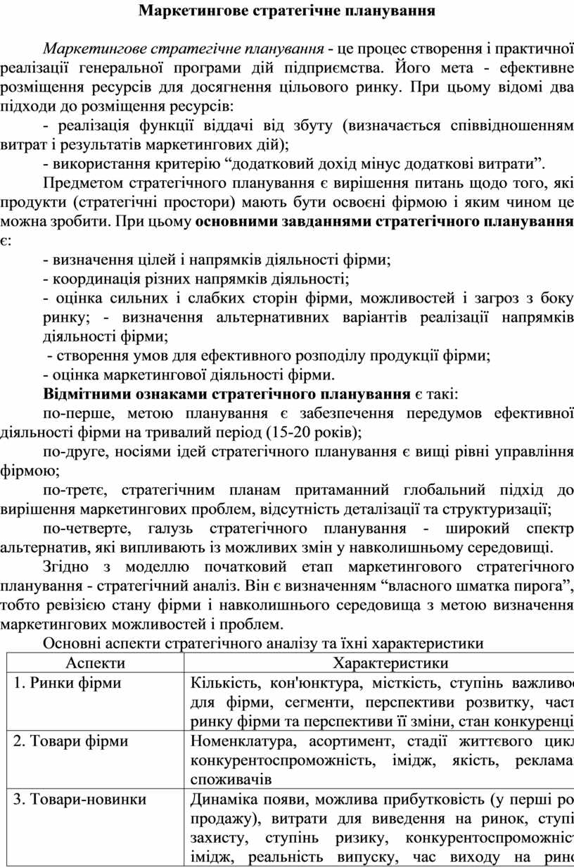 Стратегічний аналіз - це аналітична основа маркетингового стратегічного планування. Після його здійснення переходять до безпосередньої розробки стратегічного плану маркетингу. Тут перший крок - це визначення місії та цілей фірми.