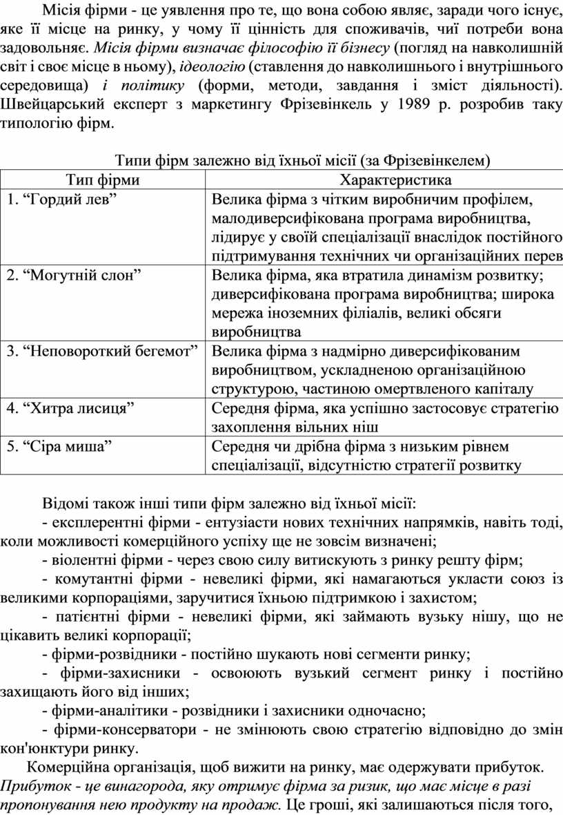 Місія фірми - це уявлення про те, що вона собою являє, заради чого існує, яке її місце на ринку, у чому її цінність для споживачів, чиї потреби вона задовольняє. Місія фірми визначає філософію її бізнесу (погляд на навколишній світ і своє місце в ньому), ідеологію (ставлення до навколишнього і внутрішнього середовища) і політику (форми, методи, завдання і зміст діяльності). Швейцарський експерт з маркетингу Фрізевінкель у 1989 р. розробив таку типологію фірм.
