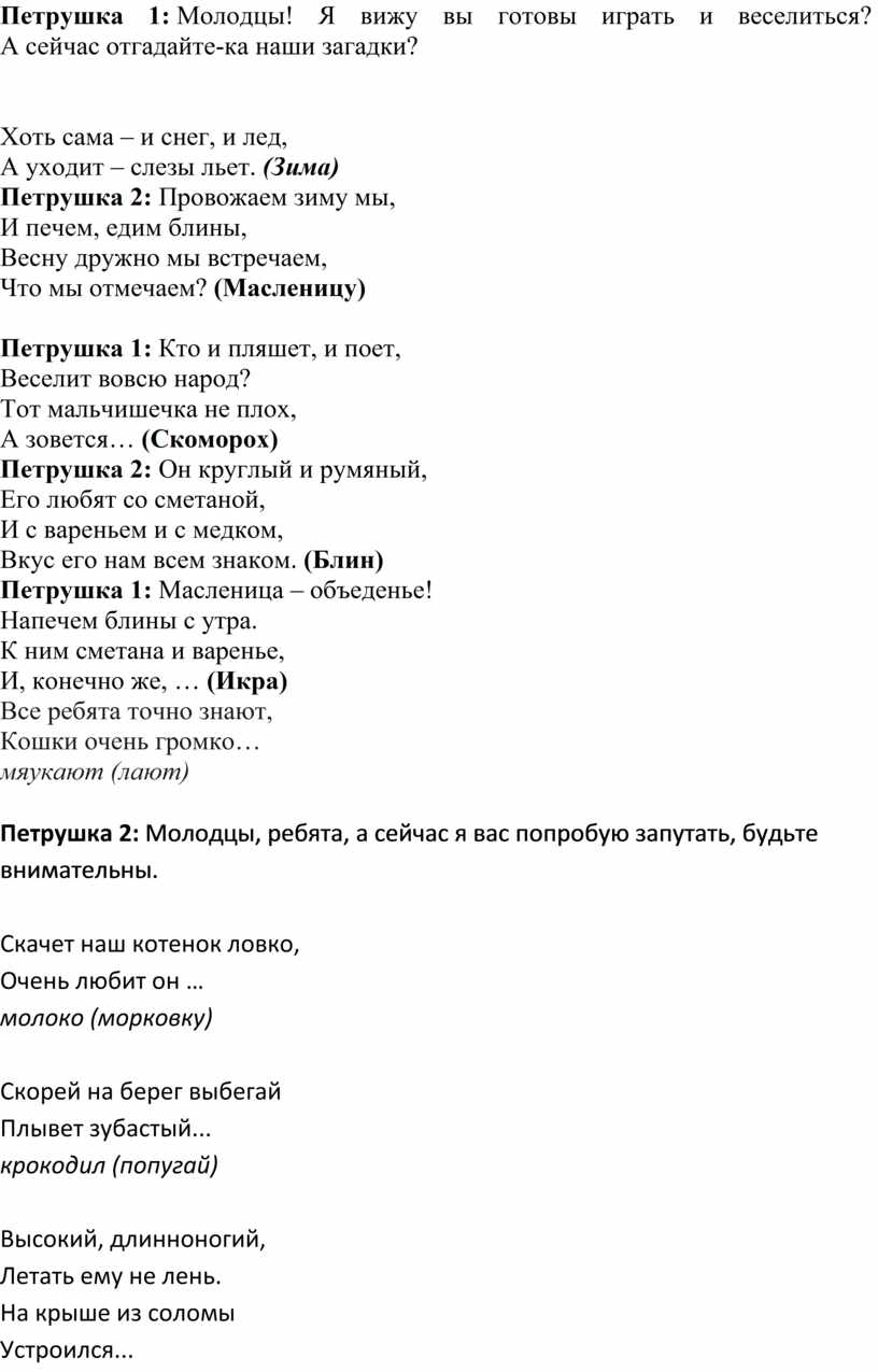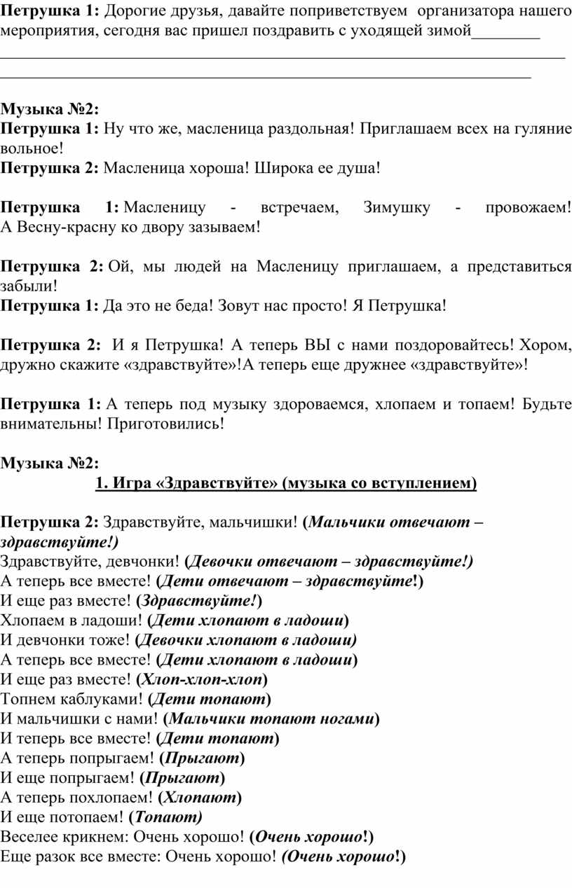 Петрушка 1: Дорогие друзья, давайте поприветствуем организатора нашего мероприятия, сегодня вас пришел поздравить с уходящей зимой________
