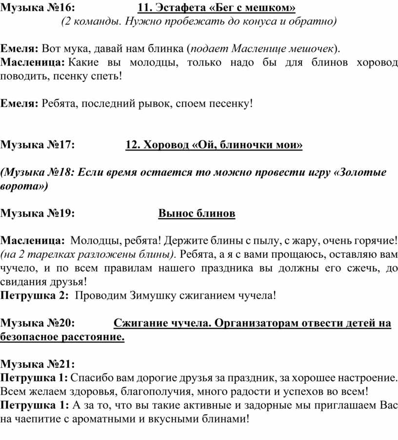 Масленица: Молодцы, ребята! Держите блины с пылу, с жару, очень горячие! (на 2 тарелках разложены блины). Ребята, а я с вами прощаюсь, оставляю вам чучело, и по всем правилам нашего праздника вы должны его сжечь, до свидания друзья!