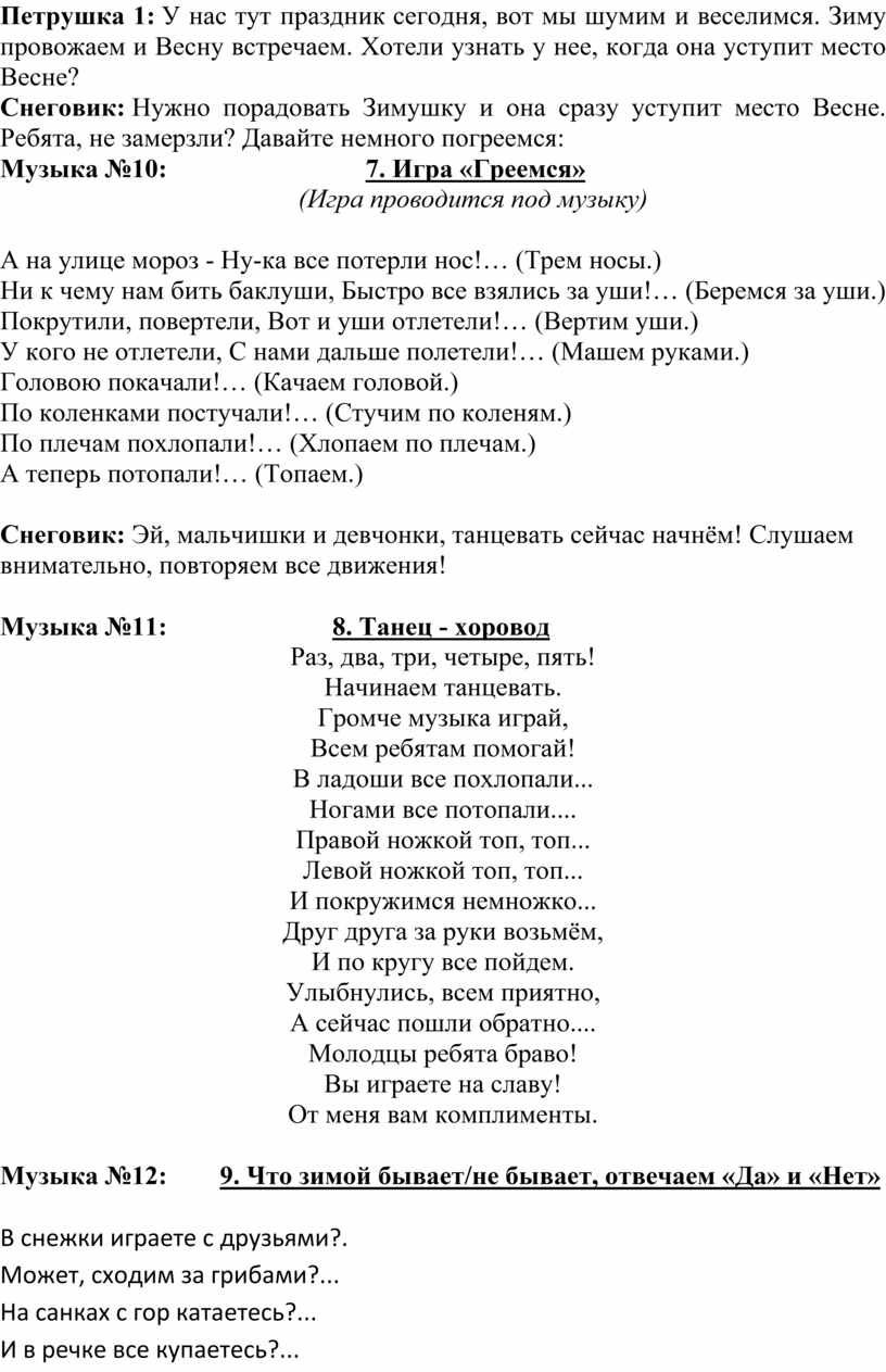 Снеговик: Нужно порадовать Зимушку и она сразу уступит место Весне. Ребята, не замерзли? Давайте немного погреемся: