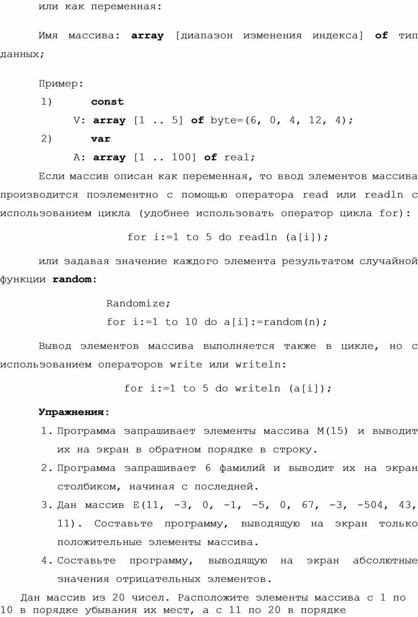 Если массив описан как переменная, то ввод элементов массива производится поэлементно с помощью оператора read или readln с использованием цикла (удобнее использовать оператор цикла for):
