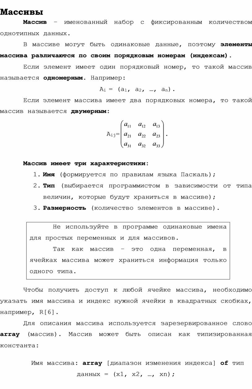 Массив – именованный набор с фиксированным количеством однотипных данных.
