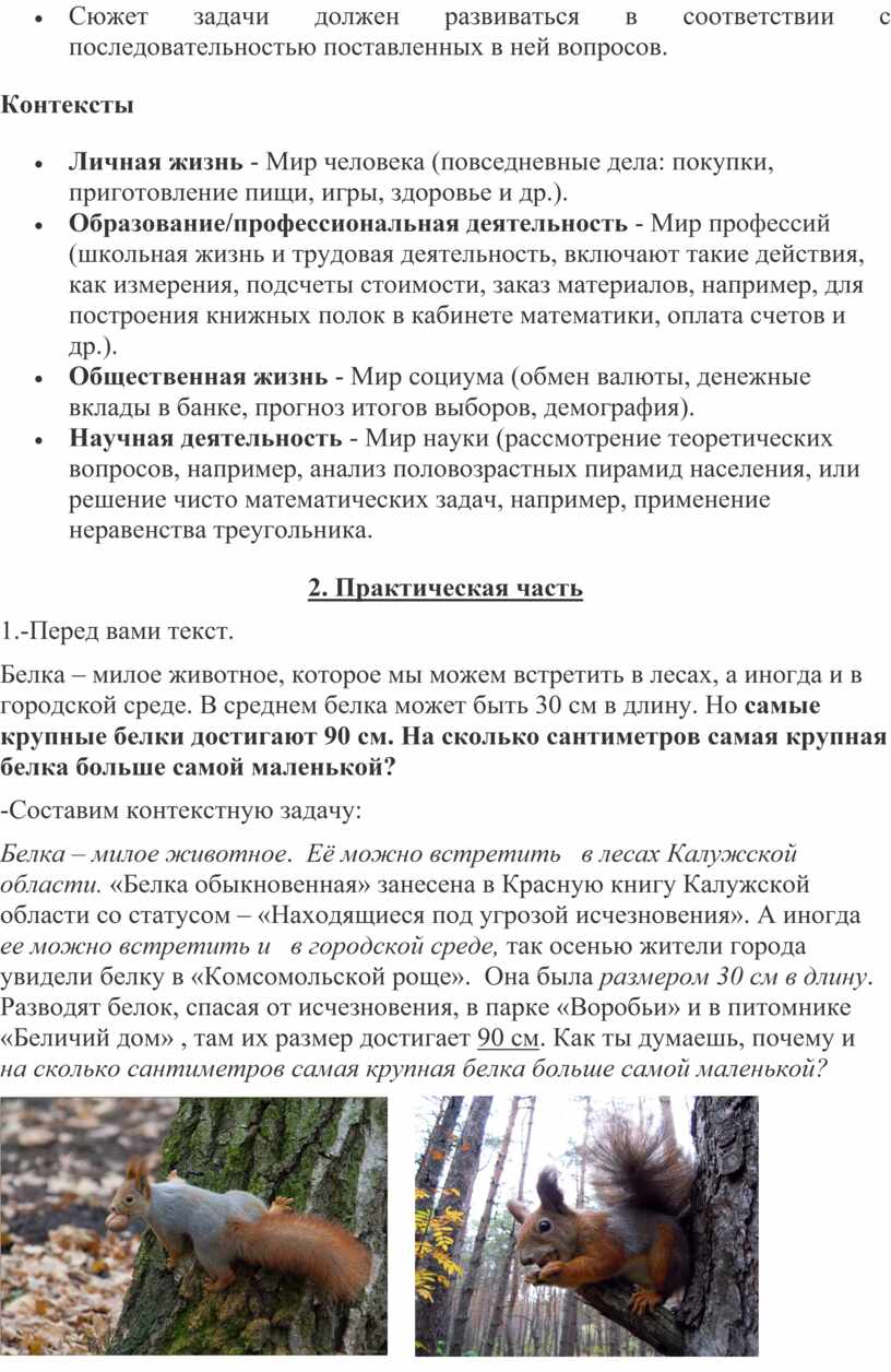 Белка – милое животное. Её можно встретить в лесах Калужской области. «Белка обыкновенная» занесена в Красную книгу Калужской области со статусом – «Находящиеся под угрозой исчезновения». А иногда ее можно встретить и в городской среде, так осенью жители города увидели белку в «Комсомольской роще». Она была размером 30 см в длину. Разводят белок, спасая от исчезновения, в парке «Воробьи» и в питомнике «Беличий дом» , там их размер достигает 90 см. Как ты думаешь, почему и на сколько сантиметров самая крупная белка больше самой маленькой?