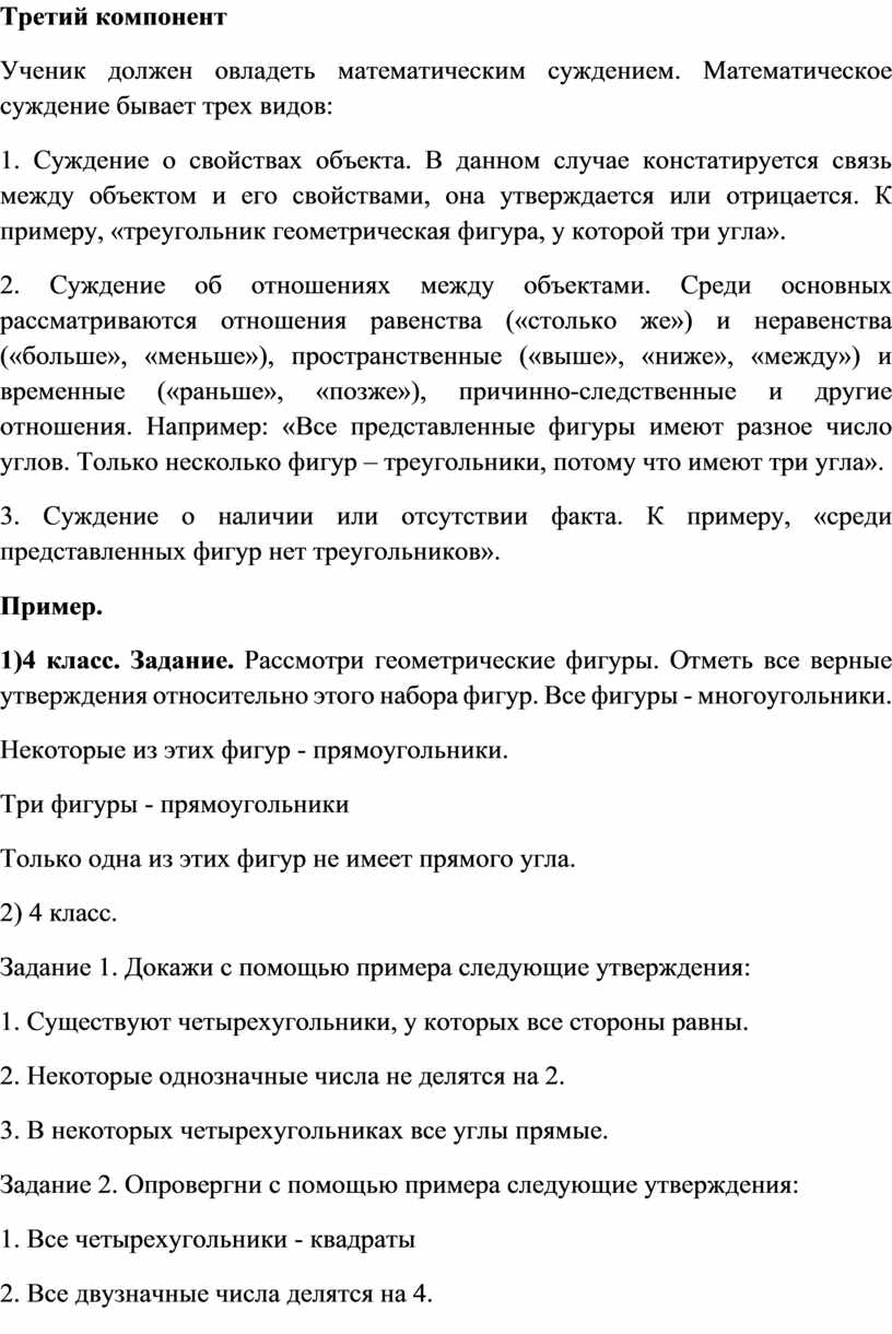 2. Суждение об отношениях между объектами. Среди основных рассматриваются отношения равенства («столько же») и неравенства («больше», «меньше»), пространственные («выше», «ниже», «между») и временные («раньше», «позже»), причинно-следственные и другие отношения. Например: «Все представленные фигуры имеют разное число углов. Только несколько фигур – треугольники, потому что имеют три угла».