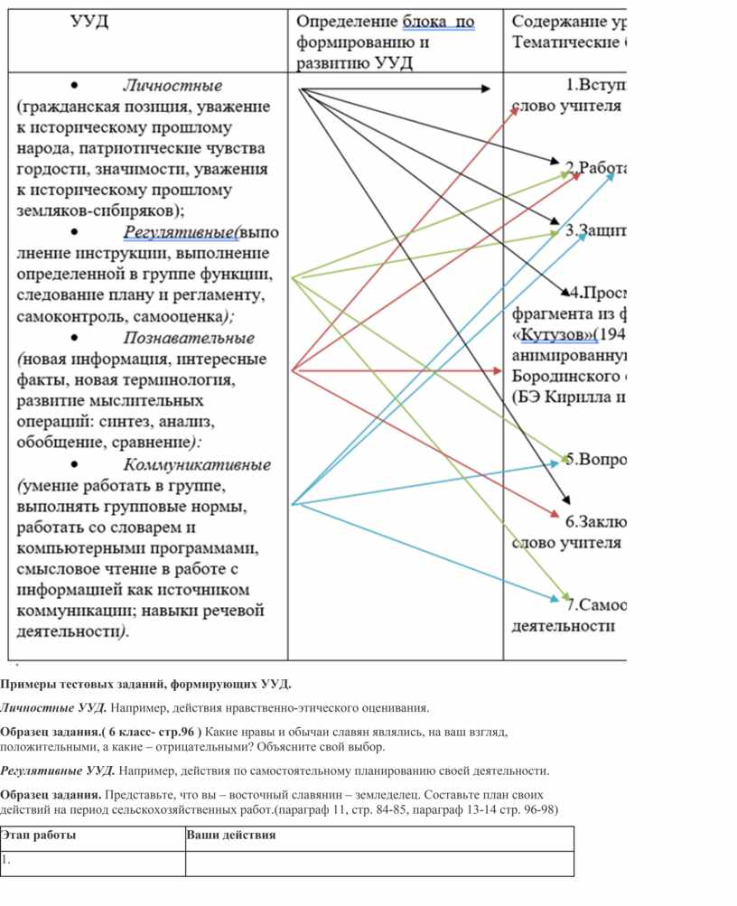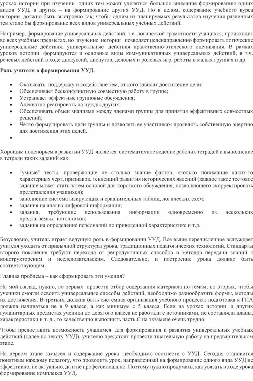 Овладение учащимися универсальными учебными действиями происходит в контексте разных учебных предметов. Совершенно очевидно, что жёсткой градации по формированию определённого вида УУД в процессе изучения конкретного предмета нет и не может быть. Однако, перенос акцентов возможен. На уроках истории при изучении одних тем может уделяться большое внимание формированию одних видов УУД, в других – на формирование других УУД. Но в целом, содержание учебного курса истории должно быть выстроено так, чтобы одним из планируемых результатов изучения различных тем стало бы формирование всех видов универсальных учебных действий.