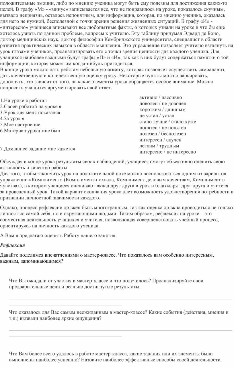 Однако, процесс рефлексии должен быть многогранным, так как оценка должна проводиться не только личностью самой себя, но и окружающими людьми. Таким образом, рефлексия на уроке – это совместная деятельность учащихся и учителя, позволяющая совершенствовать учебный процесс, ориентируясь на личность каждого ученика.