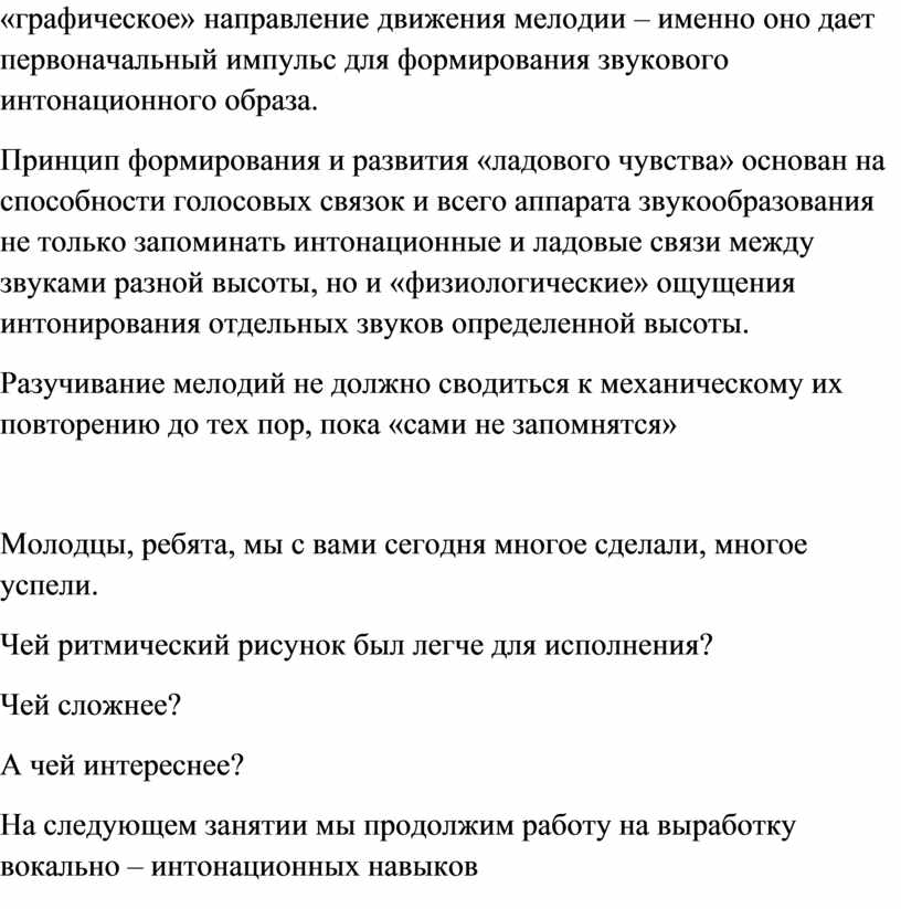 6. Подведение итога : постоянно обращать внимание на «графическое» направление движения мелодии – именно оно дает первоначальный импульс для формирования звукового интонационного образа.