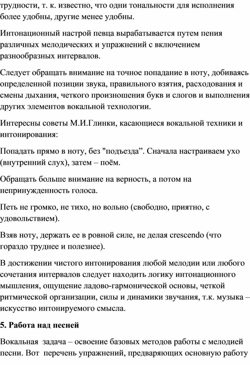 Интересны советы М.И.Глинки, касающиеся вокальной техники и интонирования: