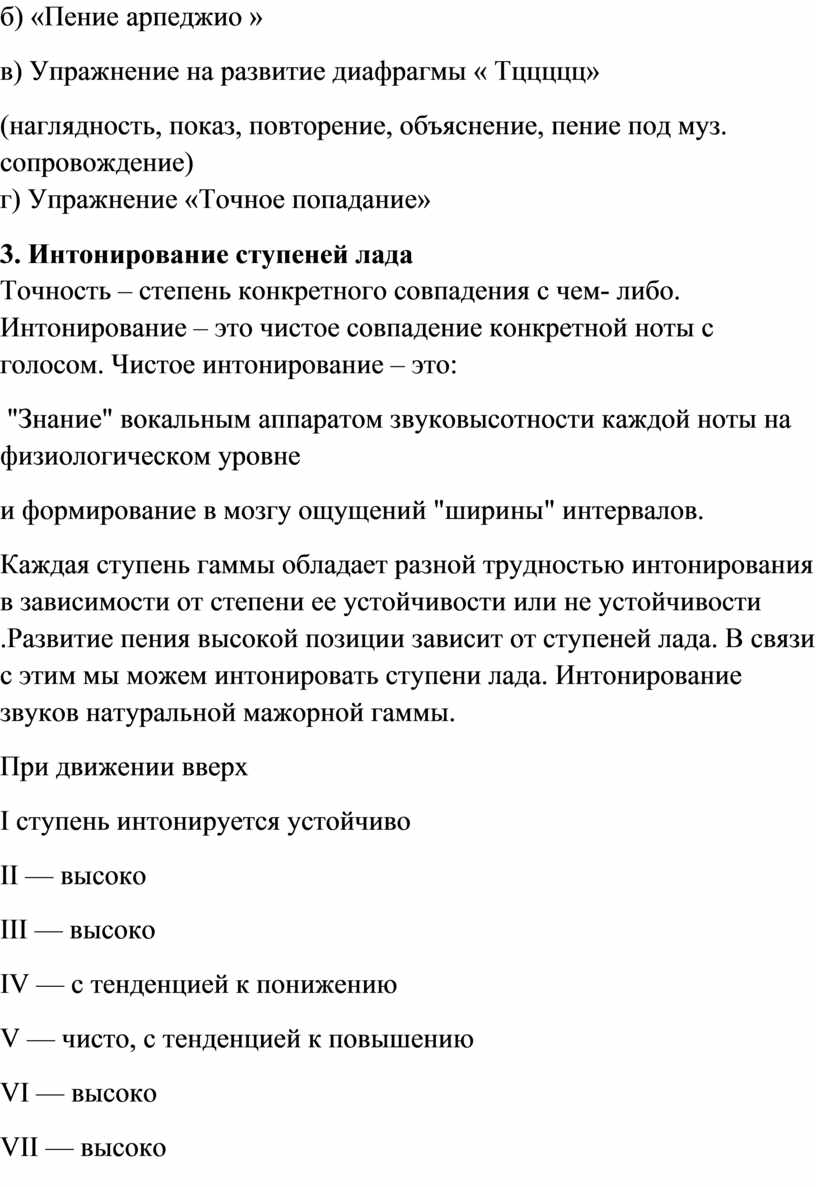 Каждая ступень гаммы обладает разной трудностью интонирования в зависимости от степени ее устойчивости или не устойчивости .Развитие пения высокой позиции зависит от ступеней лада. В связи с этим мы можем интонировать ступени лада. Интонирование звуков натуральной мажорной гаммы.