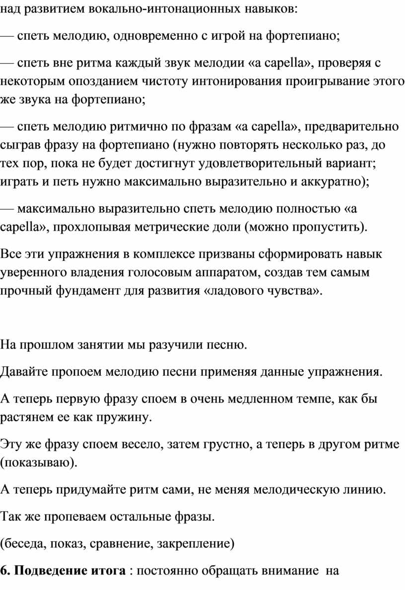 — спеть мелодию ритмично по фразам «a capella», предварительно сыграв фразу на фортепиано (нужно повторять несколько раз, до тех пор, пока не будет достигнут удовлетворительный вариант; играть и петь нужно максимально выразительно и аккуратно);