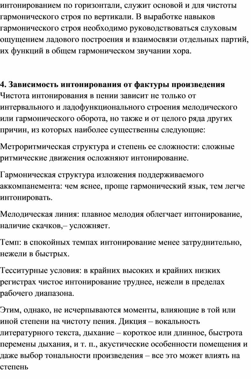 4. Зависимость интонирования от фактуры произведения Чистота интонирования в пении зависит не только от интервального и ладофункционального строения мелодического или гармонического оборота, но также и от целого ряда других причин, из которых наиболее существенны следующие: