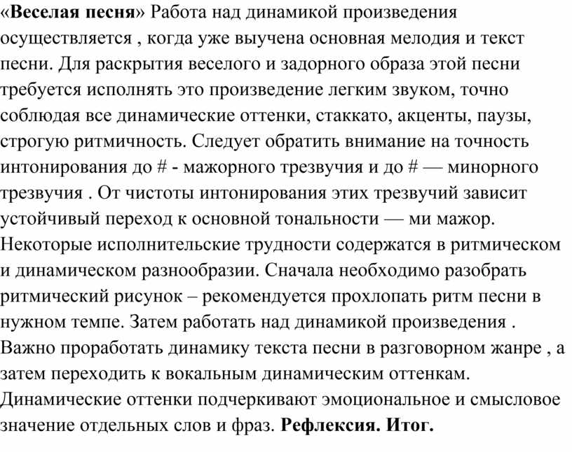 «Веселая песня» Работа над динамикой произведения осуществляется , когда уже выучена основная мелодия и текст песни. Для раскрытия веселого и задорного образа этой песни требуется исполнять это произведение легким звуком, точно соблюдая все динамические оттенки, стаккато, акценты, паузы, строгую ритмичность. Следует обратить внимание на точность интонирования до # - мажорного трезвучия и до # — минорного трезвучия . От чистоты интонирования этих трезвучий зависит устойчивый переход к основной тональности — ми мажор. Некоторые исполнительские трудности содержатся в ритмическом и динамическом разнообразии. Сначала необходимо разобрать ритмический рисунок – рекомендуется прохлопать ритм песни в нужном темпе. Затем работать над динамикой произведения . Важно проработать динамику текста песни в разговорном жанре , а затем переходить к вокальным динамическим оттенкам. Динамические оттенки подчеркивают эмоциональное и смысловое значение отдельных слов и фраз. Рефлексия. Итог.