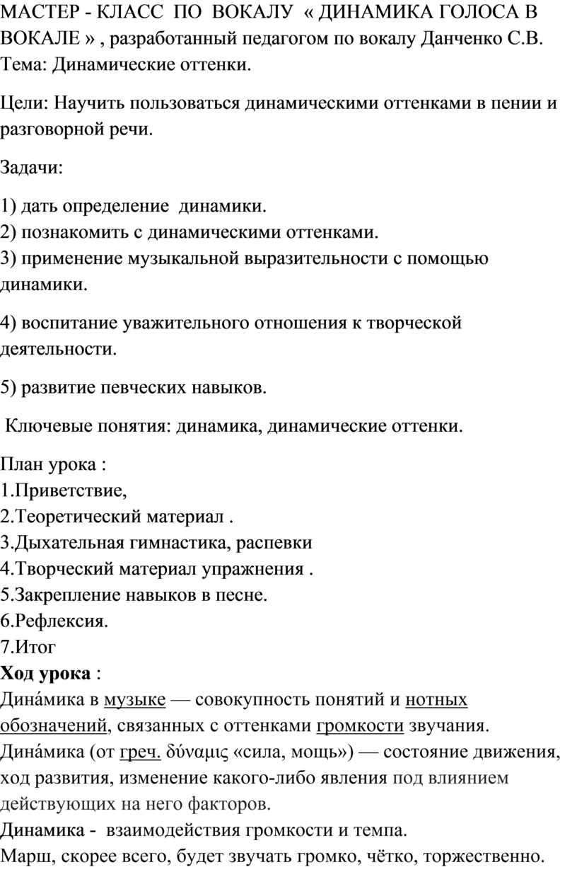 МАСТЕР - КЛАСС ПО ВОКАЛУ « ДИНАМИКА ГОЛОСА В ВОКАЛЕ » , разработанный педагогом по вокалу Данченко С.В. Тема: Динамические оттенки.