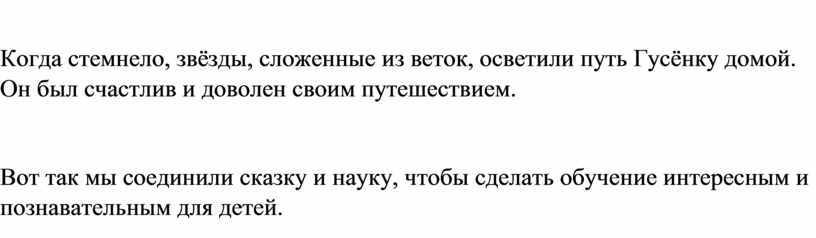 Когда стемнело, звёзды, сложенные из веток, осветили путь Гусёнку домой. Он был счастлив и доволен своим путешествием.