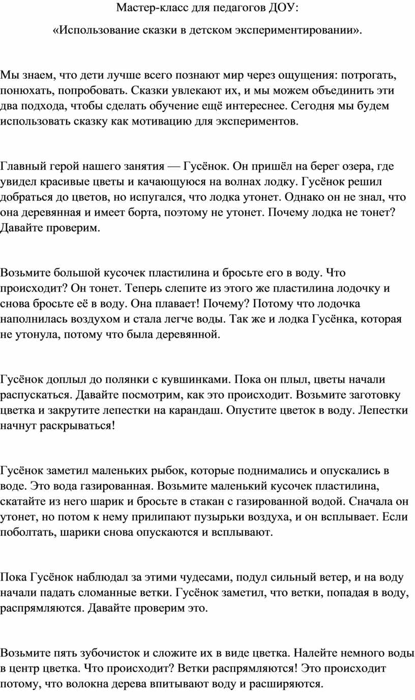 Возьмите большой кусочек пластилина и бросьте его в воду. Что происходит? Он тонет. Теперь слепите из этого же пластилина лодочку и снова бросьте её в воду. Она плавает! Почему? Потому что лодочка наполнилась воздухом и стала легче воды. Так же и лодка Гусёнка, которая не утонула, потому что была деревянной.