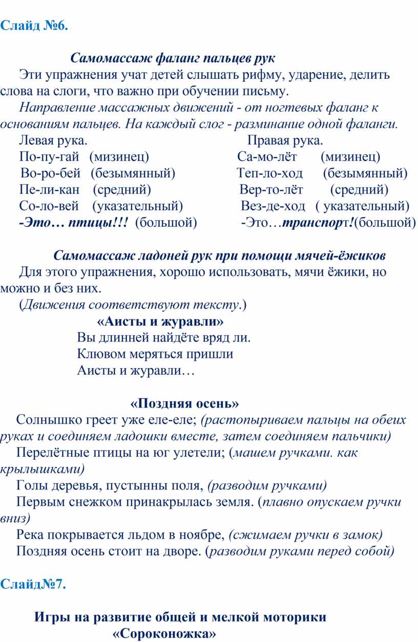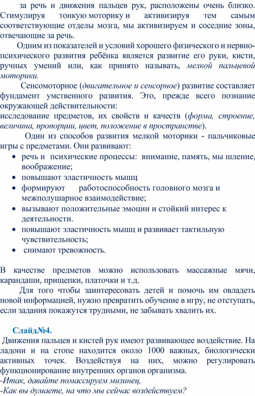 Движения пальцев и кистей рук имеют развивающее воздействие. На ладони и на стопе находится около 1000 важных, биологически активных точек. Воздействуя на них, можно регулировать функционирование внутренних органов организма.