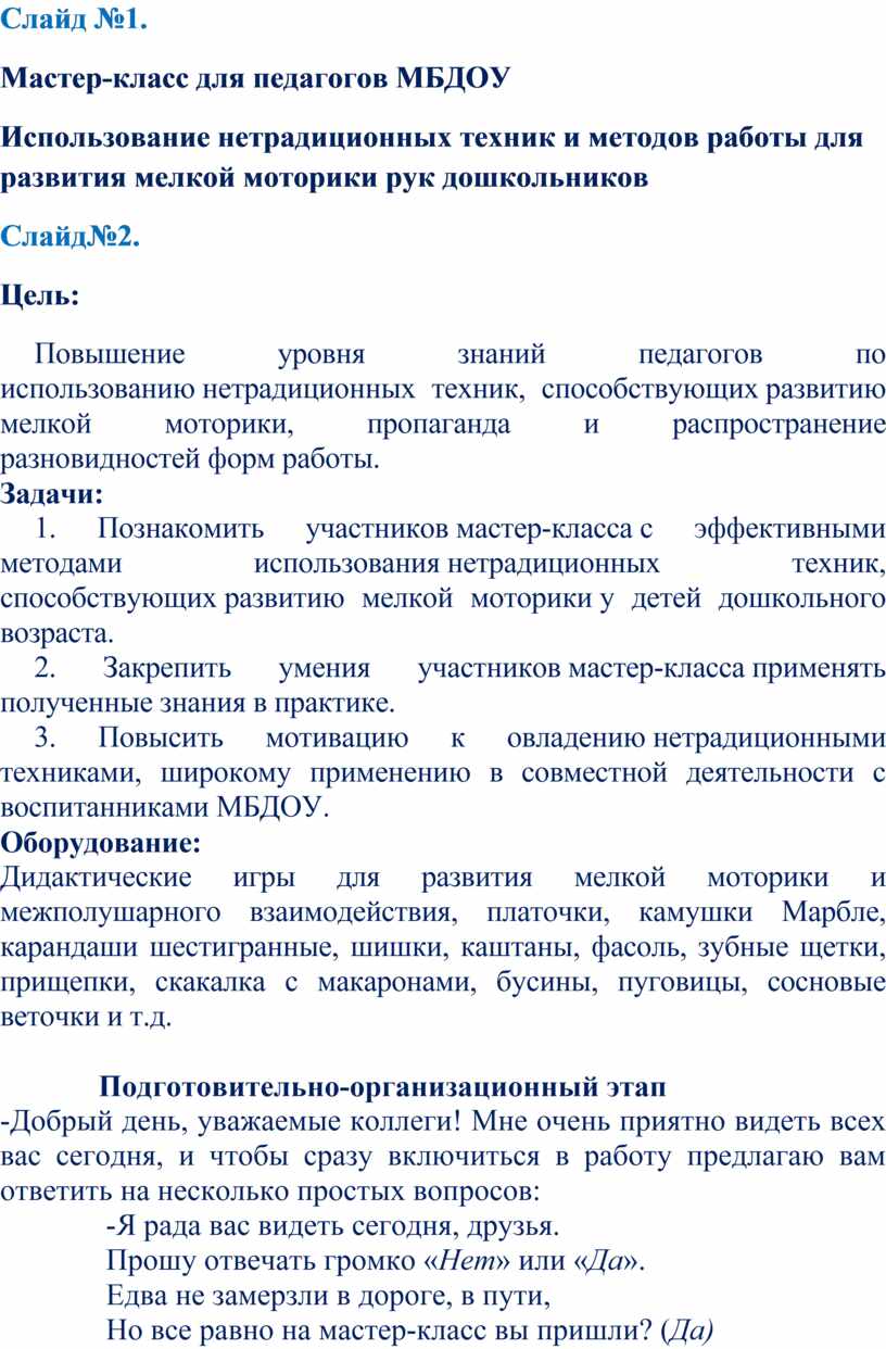 1. Познакомить участников мастер-класса с эффективными методами использования нетрадиционных техник, способствующих развитию мелкой моторики у детей дошкольного возраста.