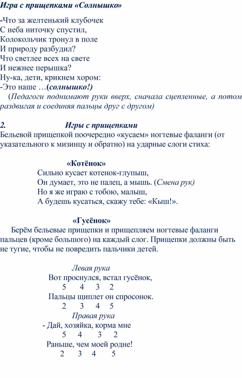 Бельевой прищепкой поочередно «кусаем» ногтевые фаланги (от указательного к мизинцу и обратно) на ударные слоги стиха: