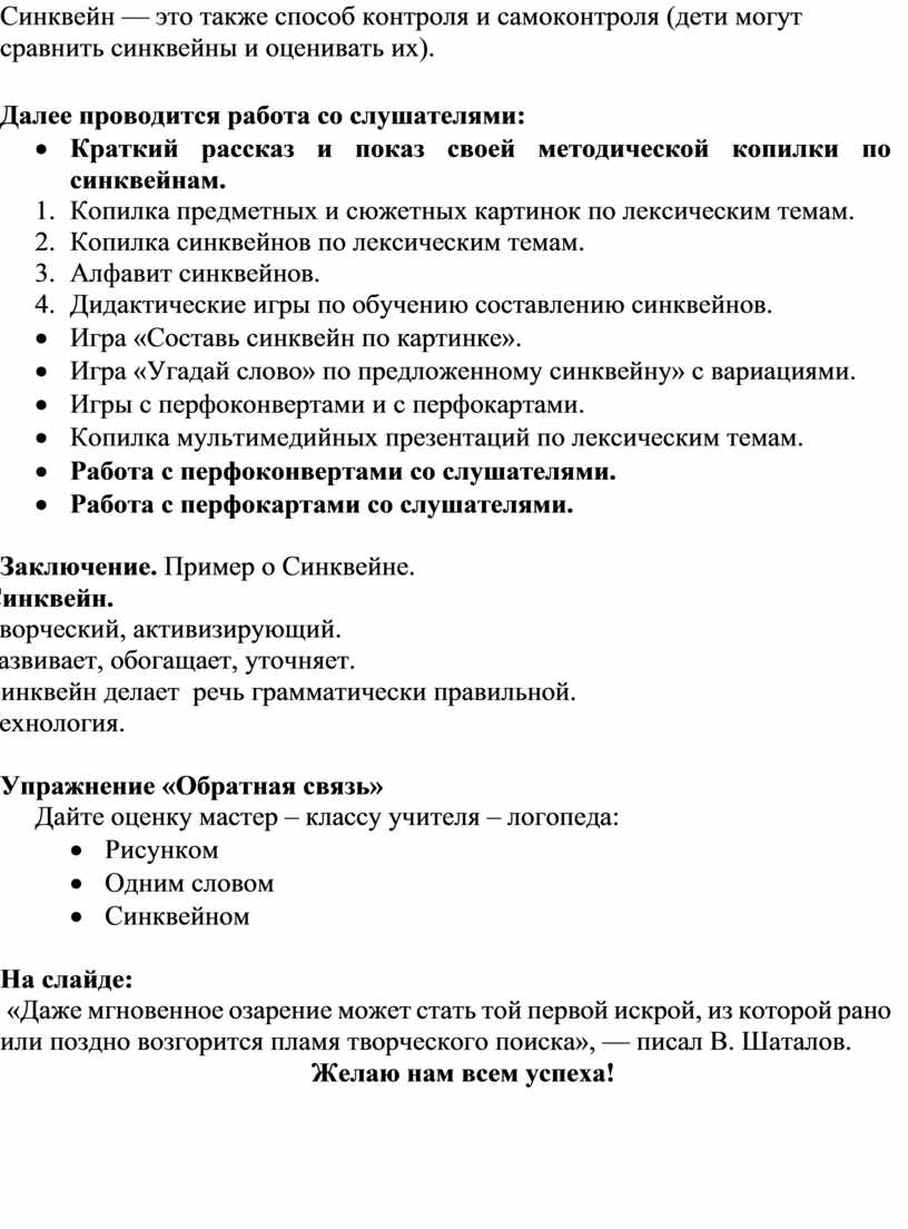 · Синквейн — это также способ контроля и самоконтроля (дети могут сравнить синквейны и оценивать их).