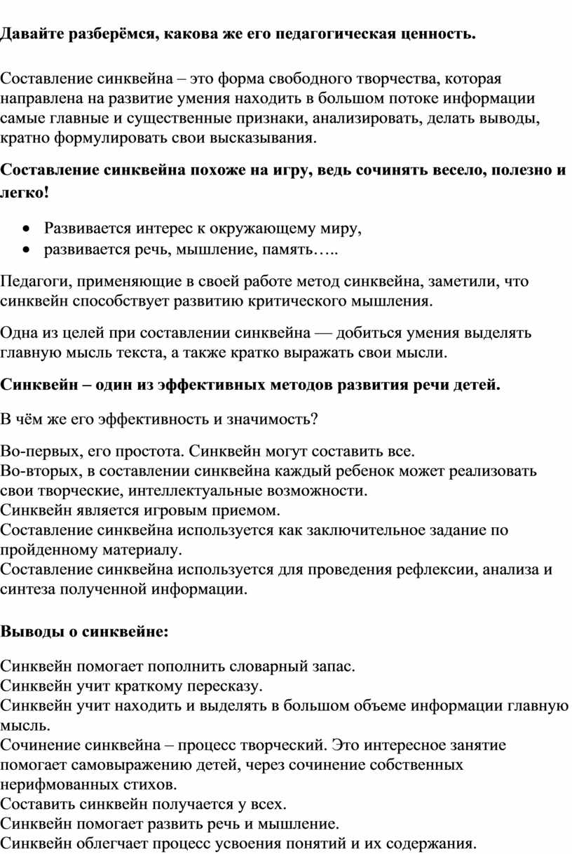 · Синквейн учит краткому пересказу.